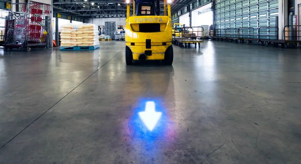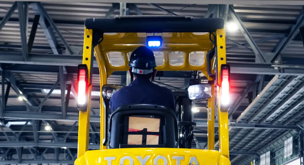 フォークリフト後退時の労災事故、商品事故防止を目的とした取り組みとして、ブルーライトの設置を行い、2020年7月に全ての店所で所有しているフォークリフトに設置が完了しました。