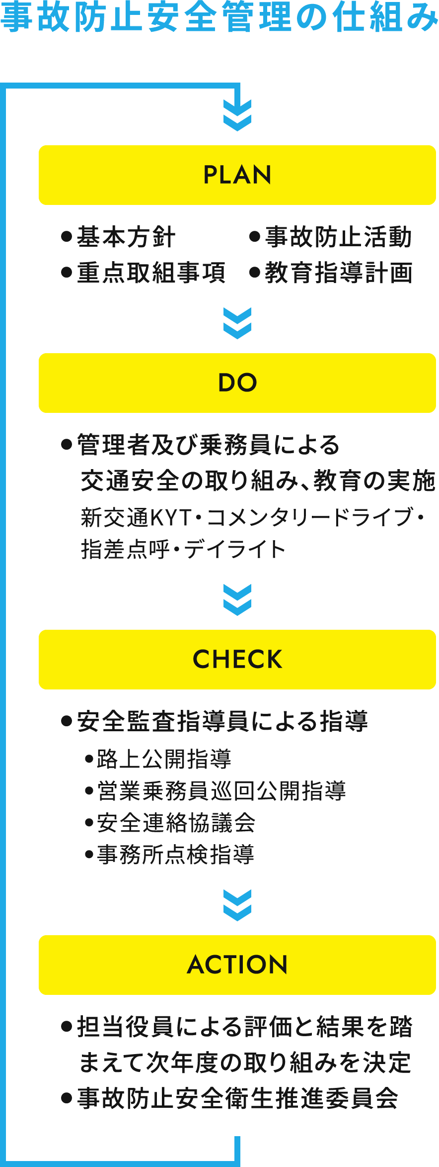 事故防止の強化を図るため、乗務員一人ひとりに3段階評価を実施し、結果に応じた指導を行う「安全管理強化システム」を推進しています。