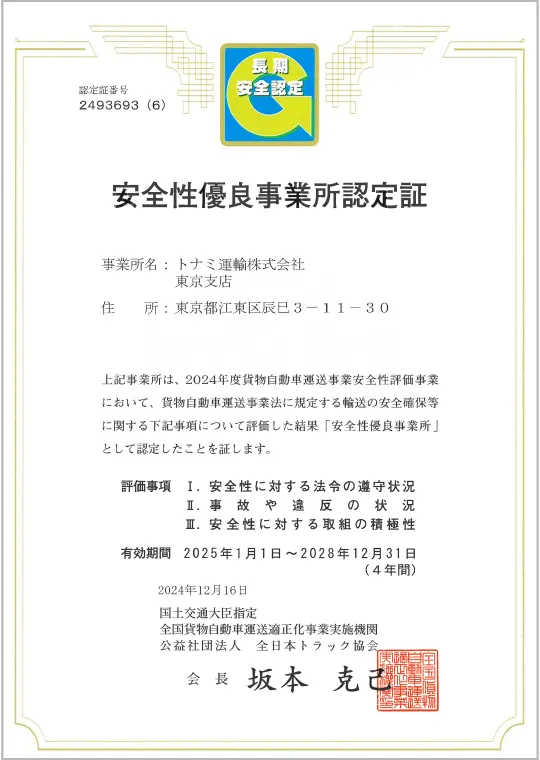公益社団法人全日本トラック協会が認定する、安全性優良事業所(Gマーク)の取得を推進しています。