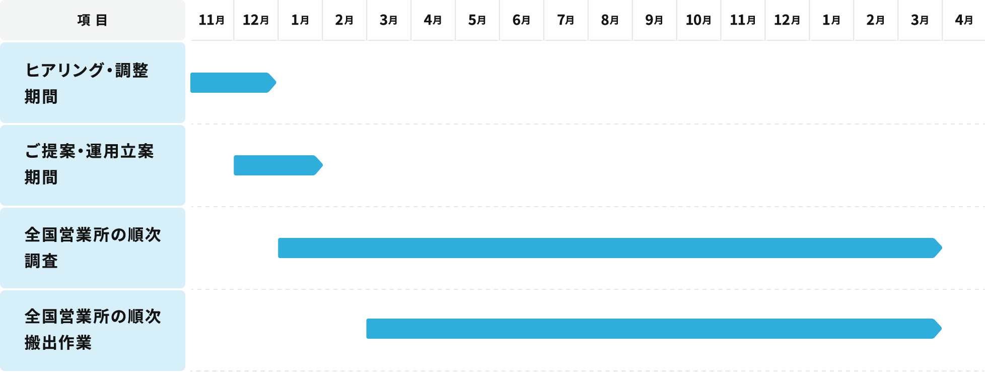 全国各地の営業所に残る不要となった什器・備品の搬出および積込み作業を、約1年半という長期間にわたり一括で担当。
