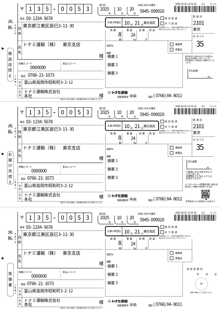 タイプD(摘要あり、バーコードあり、荷札A4ラベル)