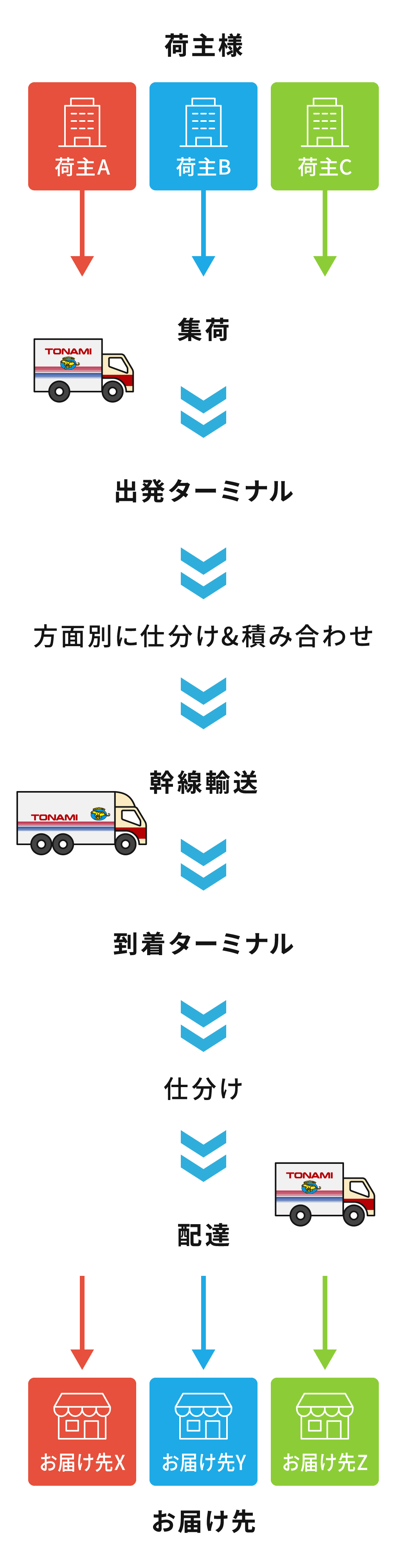 複数のお客様の荷物を同じ方面のトラックに積み合わせる(混載する)ことで、トラック1台を貸し切るほどではない物量でも、リーズナブルに輸送できるのが「特積み」のメリットです。全国を網羅するターミナルと輸送ネットワークを駆使し、効率的で無駄のない輸送を実現します。物量に応じたコストで、不定期な出荷にも柔軟に対応可能です。